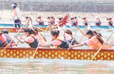 上午10點半,比賽正式開始,一條條龍舟在鼓聲中如離弦之箭,向終點駛?cè)?。選手們齊心協(xié)力,動作整齊劃一,水面上槳板翻飛。一條條龍舟如同一條條游龍在馳騁,令現(xiàn)場觀眾群情激奮。