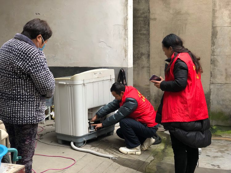 志愿者程凱亞、姚明霞到村民家中檢修洗衣機。