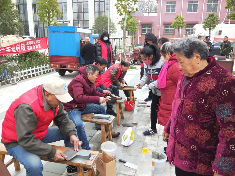 活動現(xiàn)場剛布置好,村民們就拿著菜刀、剪刀,來到了活動現(xiàn)場等候,見到到來的村民們,磨刀師傅王躍偉、王留義、馮三喜、閆軍倉、王秀根立馬擺開架勢給大家磨起了刀,大家都露出了滿意的笑容。村民們紛紛表示:“磨剪子戧菜刀”的手藝人越來越少了,在家里也很少聽到他們的吆喝聲了,家里很多刀具用的時間長了,都有點鈍了,有的放的時間長了,都生銹了,燕山路社區(qū)能來到我們村,做這樣的義務(wù)活動,真是太方便了。