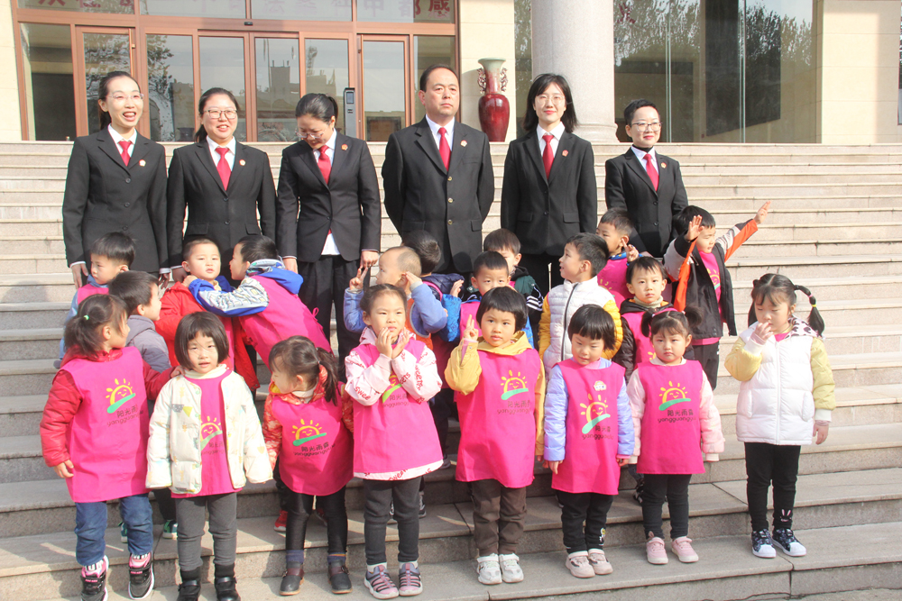 (中院法官和陽光雨露幼兒園小朋友在大樓門前留影)
