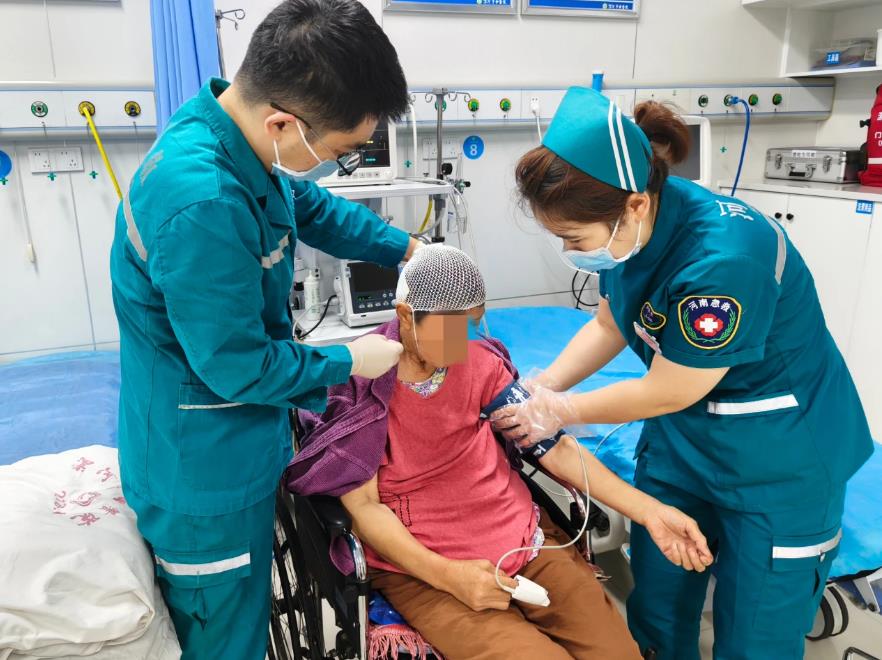 7月16日,大雨不停歇,該院急診科全天出車(chē)近20次。有的路段水深難行,醫(yī)務(wù)人員淌水到病人家中,第一時(shí)間為患者診治。在急診室內(nèi),急診醫(yī)生為外傷患者包扎傷口后詢(xún)問(wèn)患者情況,護(hù)士長(zhǎng)段銳為患者測(cè)量生命體征。