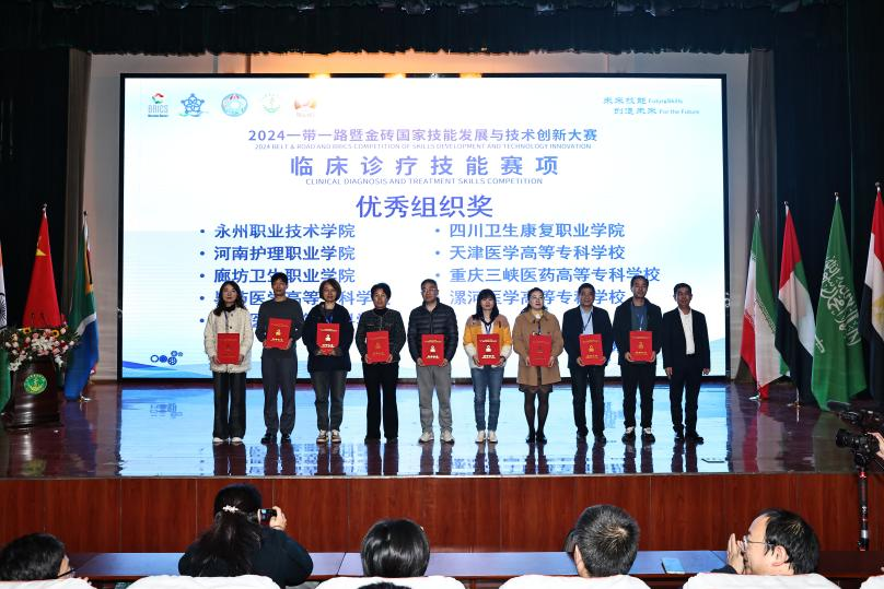 2024年11月17日,2024“一帶一路”暨金磚國(guó)家技能發(fā)展與技術(shù)創(chuàng)新大賽臨床診療技能賽項(xiàng)圓滿落幕,來(lái)自全國(guó)共計(jì)45支參賽隊(duì)、90名參賽選手參賽。漯河醫(yī)專臨床醫(yī)學(xué)院兩名參賽選手劉必海、王敏展現(xiàn)出了扎實(shí)的專業(yè)技能和卓越的團(tuán)隊(duì)協(xié)作精神,在激烈的競(jìng)爭(zhēng)中憑借出色表現(xiàn),斬獲銀牌(團(tuán)隊(duì)二等獎(jiǎng)),陳杰、范柳笛獲“優(yōu)秀指導(dǎo)教師”稱號(hào),學(xué)校獲“優(yōu)秀組織獎(jiǎng)”。