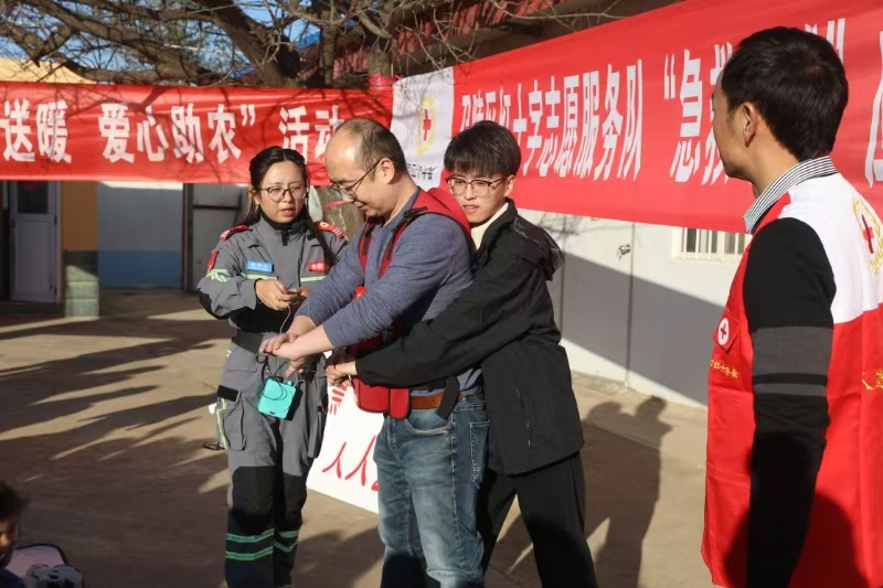 首先進(jìn)行“急救地攤”應(yīng)急救護(hù)演練,區(qū)紅十字志愿者們攜帶急救設(shè)備,現(xiàn)場演示急救技能,通過“大手拉小手”的方式,家長和孩子們一起練習(xí)急救自救互救技能。