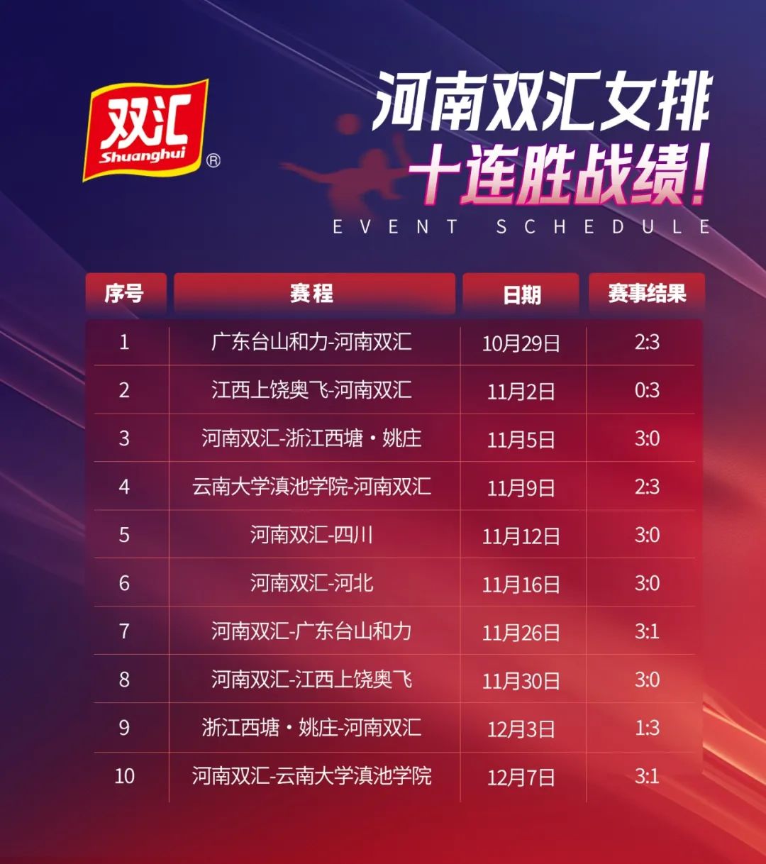經(jīng)過多年的培養(yǎng)和訓(xùn)練,河南雙匯女排打造出了自己快速多變、通力合作、更強(qiáng)更穩(wěn)的戰(zhàn)術(shù)風(fēng)格,形成了一支技術(shù)過硬、敢打敢拼、團(tuán)結(jié)向上的專業(yè)球隊。本屆排球超級聯(lián)賽開賽以來,雙匯在賽場內(nèi)外全程暖心陪伴,一方面,現(xiàn)場設(shè)置了雙匯美食補(bǔ)給站,向女排隊員和廣大觀眾提供各類健康美食,主要有簡頌單片午餐肉、鮮雞蛋棒、金馬克、爆汁香腸等;還定制發(fā)放氣氛棒、員工觀賽方陣以及設(shè)置提振勢氣、鼓勁加油的標(biāo)語口號等,滿滿的健康美味和精神給養(yǎng),全程賦能河南雙匯女排,助力隊員們豪取十連勝,見證她們創(chuàng)下了本賽季中國女排超級聯(lián)賽的一項紀(jì)錄,即成為了所有參賽隊中唯一一支保持全勝的球隊。
