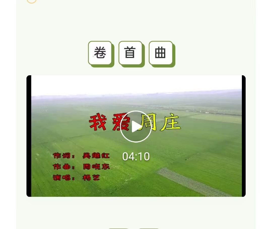 歌曲《我愛周莊》詞作者源匯區(qū)文化館吳繼紅,曲作者是原市音樂家協(xié)會(huì)主席周曉東,演唱者源匯區(qū)實(shí)驗(yàn)學(xué)校音樂老師楊藝。歌曲融入鄉(xiāng)村特色,運(yùn)用了中國(guó)民族調(diào)式,將周莊村的秀美風(fēng)光、村民勤勞勇敢的精神風(fēng)貌充分展現(xiàn)。歌詞富有詩(shī)意、旋律優(yōu)美,唱出了周莊村鄉(xiāng)村振興的美麗樂章,唱出了老百姓對(duì)當(dāng)下生活的滿足和對(duì)美好未來的期待,更唱響了周莊人的自豪感,凝聚了鄉(xiāng)情,成為鄉(xiāng)村文化的新符號(hào)。