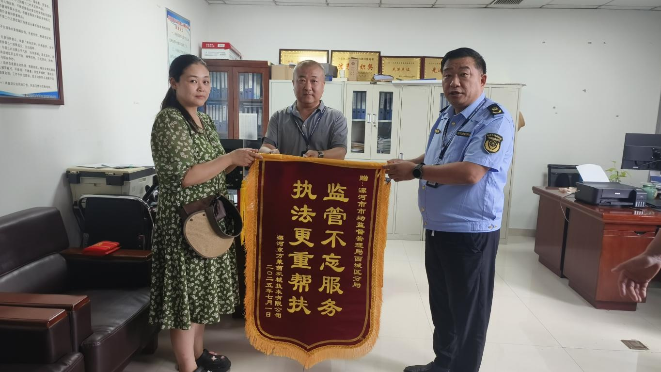 2025年7月7日下午,一名企業(yè)工作人員將一面繡著“監(jiān)管不忘服務(wù)、執(zhí)法更重幫扶”的錦旗送到漯河市市場監(jiān)督管理局西城區(qū)分局執(zhí)法人員手中,以表達對該局執(zhí)法人員幫扶企業(yè)的感謝之情。