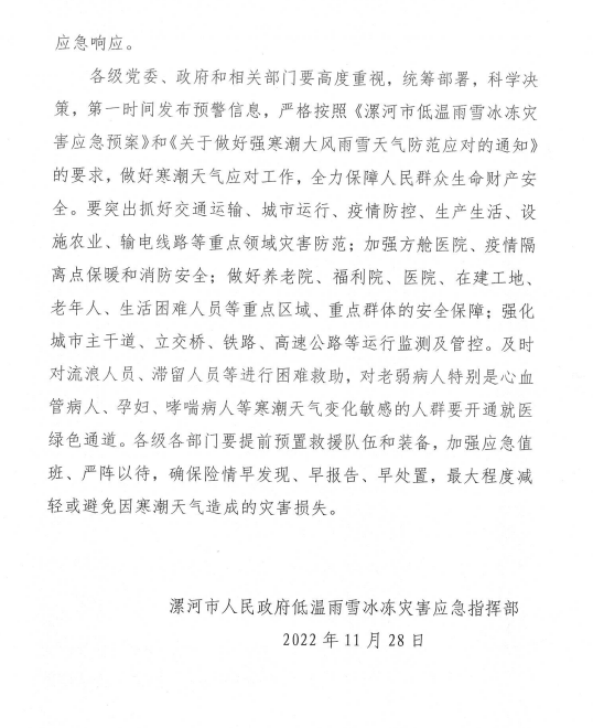 來(lái)源:漯河市人民政府低溫雨雪冰凍災(zāi)害應(yīng)急指揮部 時(shí)間:2022-11-28 14:10:00 點(diǎn)擊: