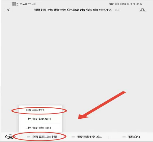 在公眾號主頁左下方點擊“問題上報”專欄,然后選擇“隨手拍”欄,按照規(guī)則提示進行操作。