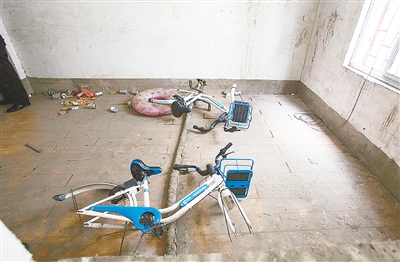 12月21日中午,記者來(lái)到市區(qū)漢江路與太行山路交叉口東北角的一處城中村,見(jiàn)三輛共享單車(chē)所在的民房垃圾遍地,一床破舊的鋪蓋堆放在一個(gè)房間里。被拆解的兩輛共享單車(chē),在二樓的一個(gè)房間內(nèi),車(chē)輪不見(jiàn)了,車(chē)鎖也被破壞。