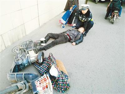 由于圍觀群眾越來越多,隨后趕來的幾名輔警一邊疏散人群、一邊疏導(dǎo)交通。張斌怕男子頭躺在地上太涼,就一直用手托著他的頭。