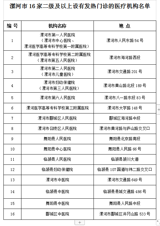 根據(jù)河南省衛(wèi)生健康委發(fā)布《關于印發(fā)河南省新型冠狀病毒感染的肺炎醫(yī)療救治定點醫(yī)院名單的通知》豫衛(wèi)醫(yī)函〔2020〕2號文件要求,全省公布了130所新型冠狀病毒感染的肺炎醫(yī)療救治定點醫(yī)院名單,漯河市共三家醫(yī)院,請廣大市民敬請關注并相互提醒,現(xiàn)公布如下:漯河市中心醫(yī)院(漯河市第一人民醫(yī)院)、臨穎縣人民醫(yī)院、舞陽縣人民醫(yī)院;漯河市傳染病醫(yī)院(救治準備醫(yī)院)。