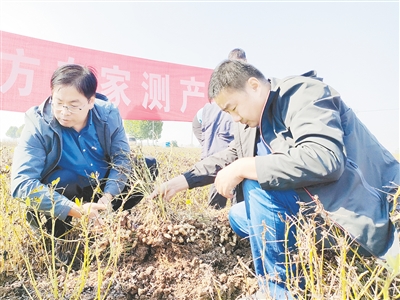 專家對史渡口村的“漯花20”花生百畝示范方進(jìn)行測產(chǎn)。