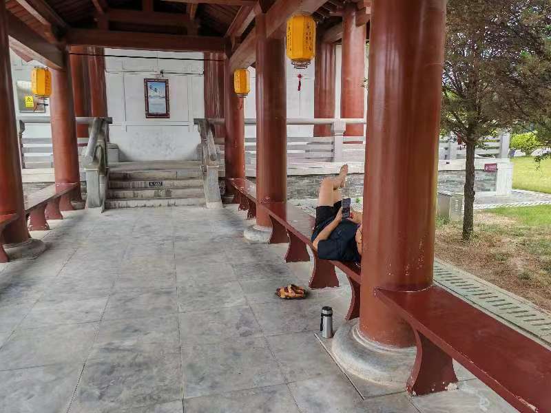 許慎文化園,這位游客光腳躺在長(zhǎng)廊下不文明