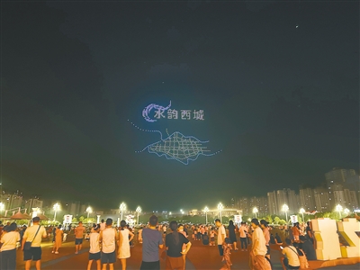 7月11日20時,上千架無人機騰空而起,先組成“漯河味道”四字,轉(zhuǎn)瞬之間化作奔騰河流與展翅飛鳥,最終組成“水韻西城”字樣。“太壯觀了!”市民舉著手機驚呼,閃光燈與夜空中的光點交相輝映。市民之家南門前廣場成了光影的海洋。