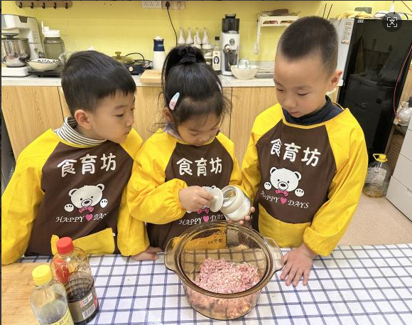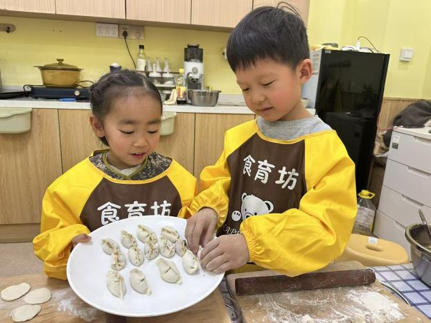 在食育坊里,孩子們穿上小圍裙,變身小小廚師。在老師手把手的指導下小心翼翼地剁著餃子餡,案板上的“噠噠”聲此起彼伏。和面時,孩子們伸手揉、捏、壓,感受著面粉從松散到成團的變化,臉上沾了面粉也笑得特別開心。