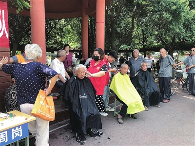 在廣場東南角的涼亭處,市第一中專的志愿者,免費為市民理發(fā)。只見志愿者們麻利地為市民披上理發(fā)圍布,仔細問清楚要求,而后認真地理發(fā)。“阿姨,我把你的頭發(fā)稍微打薄點,會比較涼快。”“剪得真好,我可滿意。謝謝你,好閨女。”市民王改坐下后,志愿者耐心地和她溝通。不一會兒,漂亮的短發(fā)讓王改高興地向志愿者道謝。