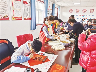 活動開始前,社區(qū)共建單位漯河市實驗中學(xué)的老師和學(xué)生們進行了寫春聯(lián)、送春聯(lián)活動,社區(qū)志愿者則在一旁包餃子。