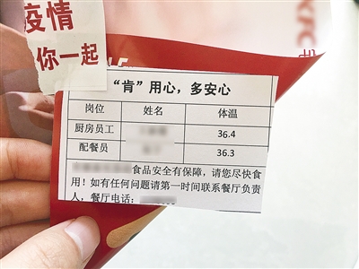 (記者 李林潤)菜品制作人是誰?配餐員是誰?他們今日的體溫是多少?近日,不少市民發(fā)現,在打包食品的袋子上或者外賣軟件上,附有一張“安心卡”,讓人看了心里特別踏實。