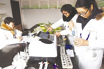 市菜辦工作人員對雙河農(nóng)產(chǎn)品批發(fā)市場的蔬菜進(jìn)行農(nóng)藥殘留檢測。 記者 胡鴻麗 攝