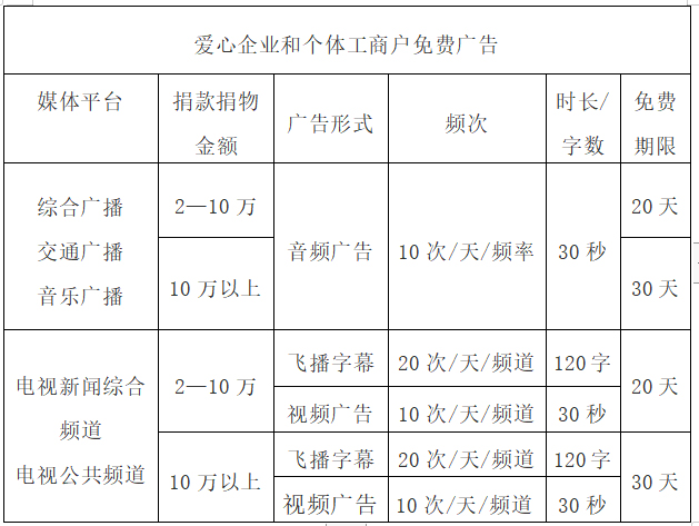 1、服務(wù)對象:在疫情防控期間,凡向我市防疫一線捐款捐物的企業(yè)、個體工商戶(包括本地和外地企業(yè)),均可享受免費(fèi)廣告服務(wù)。
