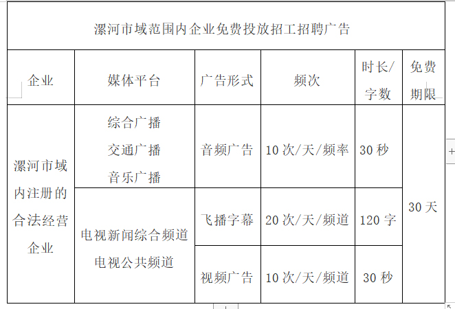 一、漯河市域范圍內(nèi)企業(yè)免費(fèi)投放招工招聘廣告