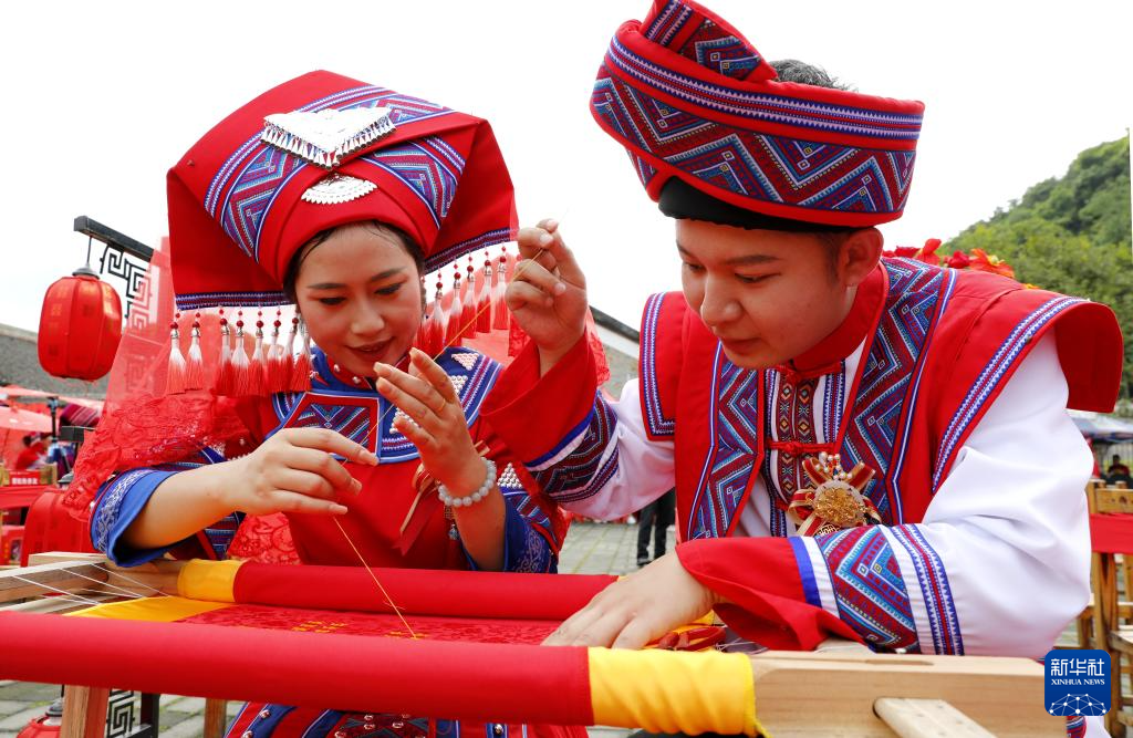 5月20日,在廣西忻城縣“520”集體婚禮現(xiàn)場,一對新人一起繡婚書。