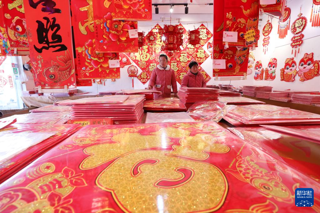 1月13日,顧客在河南省焦作市溫縣趙堡鎮(zhèn)年畫(huà)市場(chǎng)選購(gòu)新年飾品。