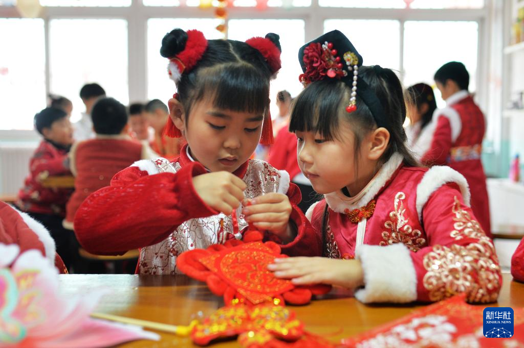 1月14日,在山東青島北仲路第二小學(xué)開(kāi)展的“國(guó)風(fēng)古韻”迎新春主題活動(dòng)上,兩名學(xué)生在給中國(guó)結(jié)固定線(xiàn)繩。