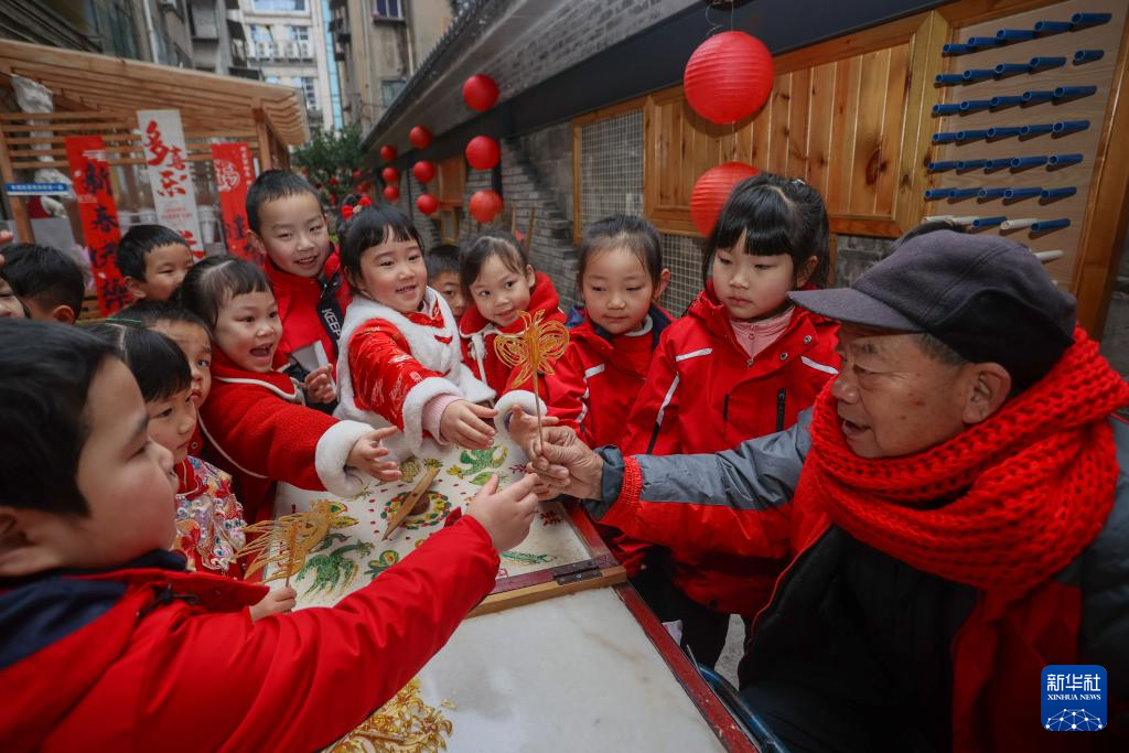 1月13日,在四川省遂寧市船山區(qū)順城街幼兒園舉辦的新春廟會(huì)上,孩子們圍觀糖畫(huà)制作。