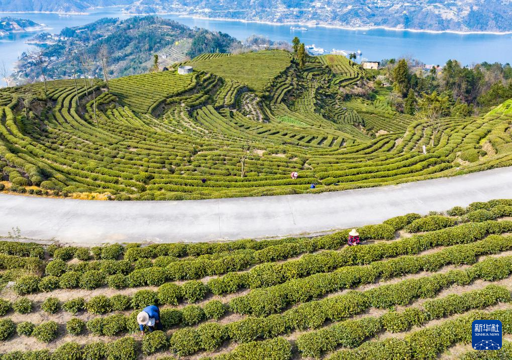 3月18日,湖北省宜昌市秭歸縣茅坪鎮(zhèn)陳家壩村村民在茶園采摘新茶(無人機照片)。