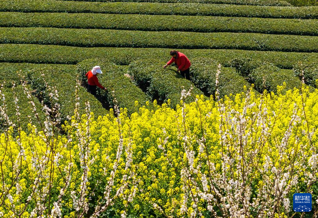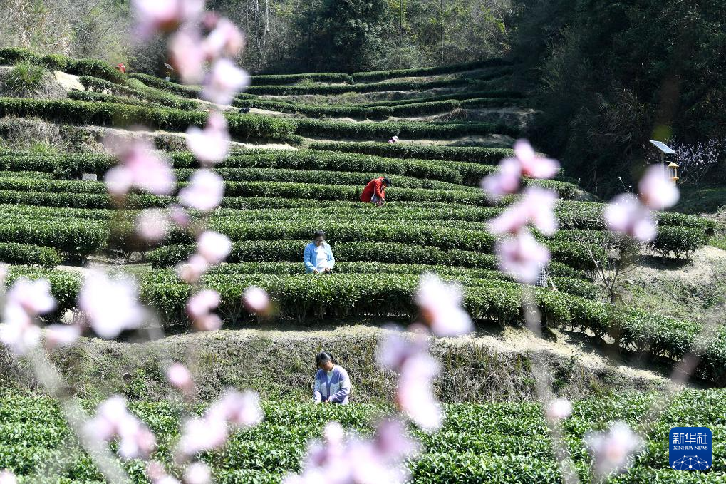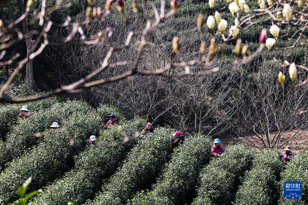 3月18日,茶農(nóng)在湖北省咸寧市通城縣四莊鄉(xiāng)寺背村臥龍溝生態(tài)有機茶業(yè)專業(yè)合作社采摘茶葉。