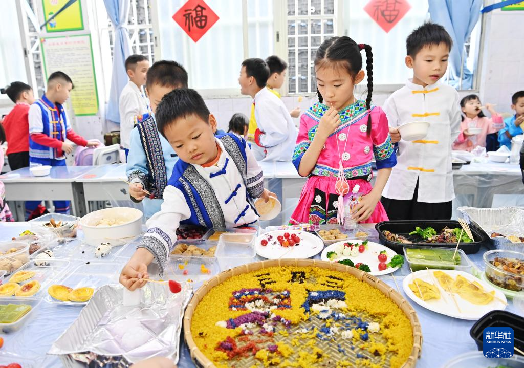 3月27日,孩子們在廣西南寧市民族大道東段小學品嘗傳統(tǒng)美食。