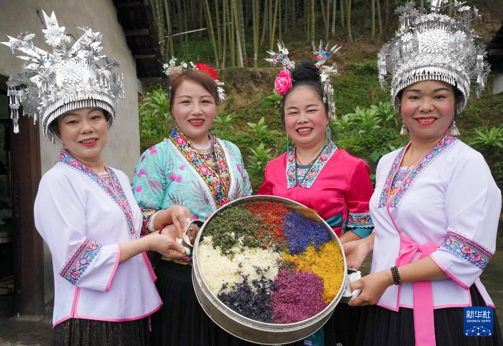 5月5日,在廣西融水苗族自治縣懷寶鎮(zhèn)盤(pán)榮村,群眾在展示五色飯。