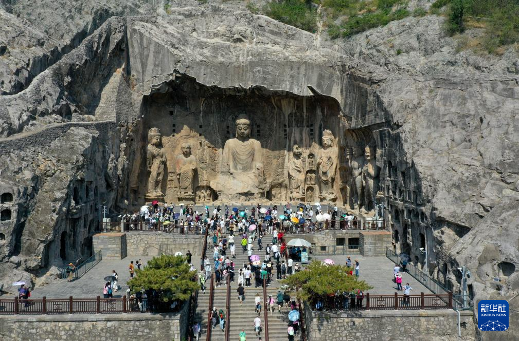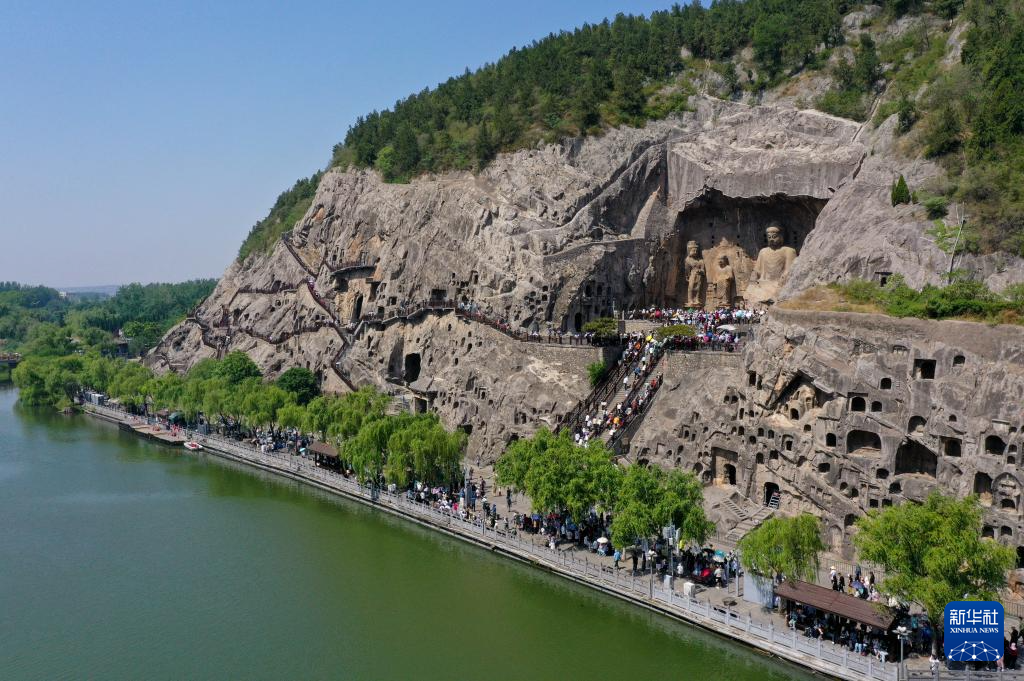 5月20日,游客在龍門石窟游玩(無人機(jī)照片)。