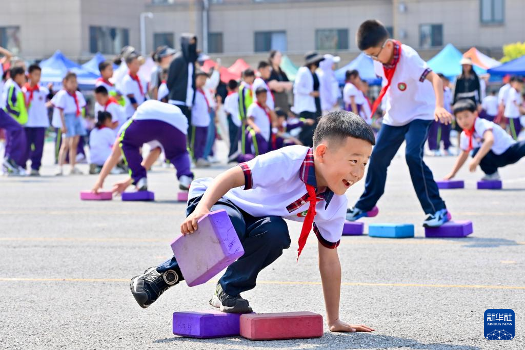 5月30日,在遼寧省鞍山市岫巖滿族自治縣實驗小學(xué),學(xué)生在趣味運動會上進行“移石過河”游戲。