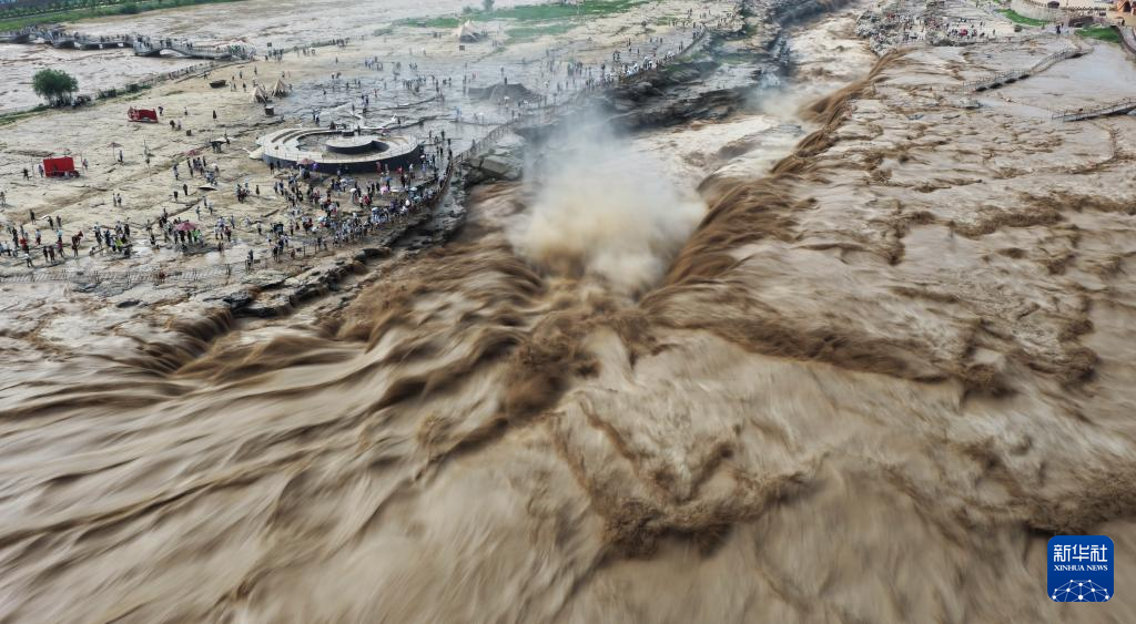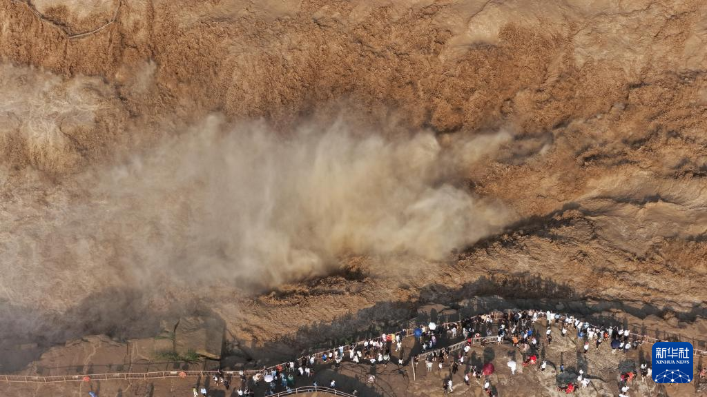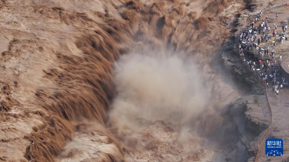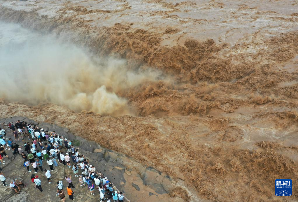 7月27日,人們?cè)谏轿骷h觀看黃河壺口瀑布(無(wú)人機(jī)照片)。